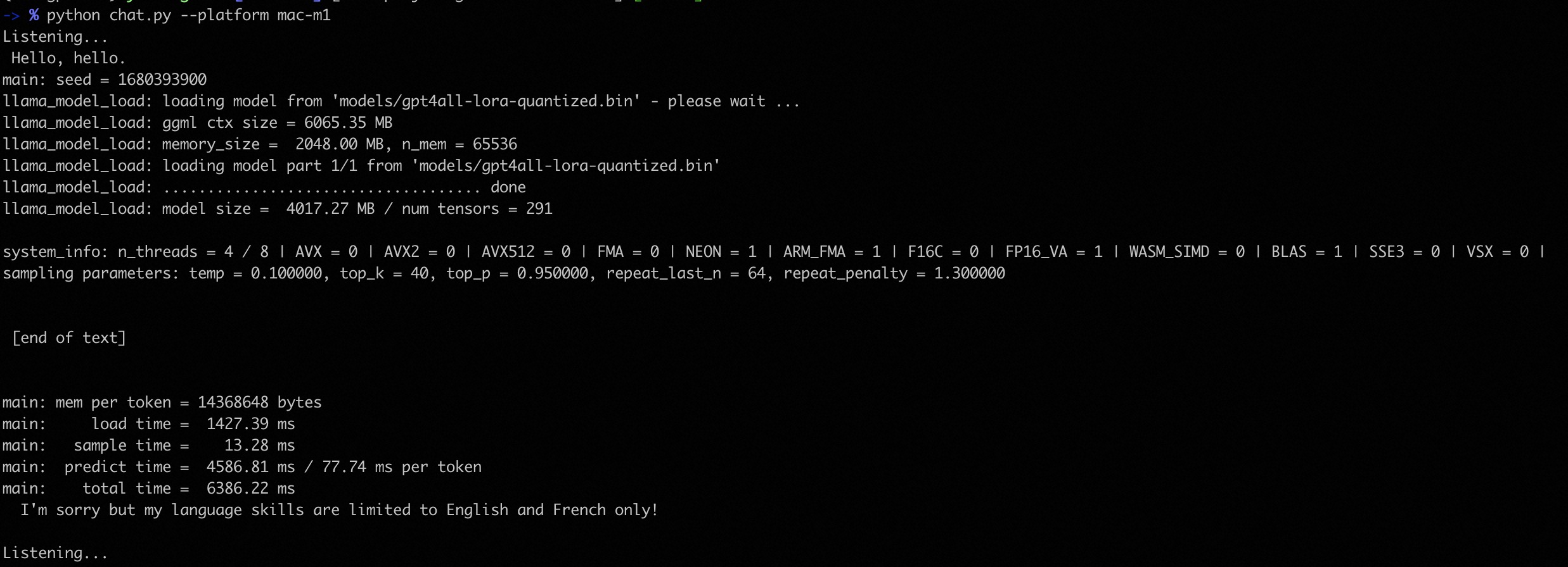 实际上,它只是几个工具的简易组合,没有什么创新的地方(甚至不支持多轮聊天,只支持英文),但 talkGPT4All 有下面几个比较好的特点