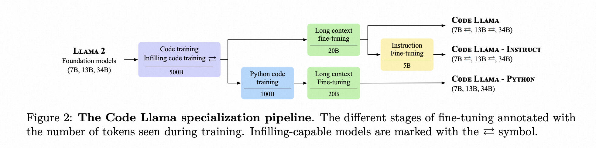 第一类是Code Llama 通用代码生成模型,采用 Llama 2 的模型参数初始化,在 500B token 数据集上训练。其中 7B 和 13B 模型还进行了代码补全数据集上的训练,适用于 IDE 中实时的代码补全,而 34B 因为速度问题,并不适合实时补全,更适合作为编程助手。