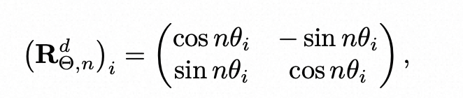 位置embedding 采用旋转位置embedding, query 和 key vector都是 Rxn的一个线性组合,而R是一个块对角矩阵,也就是只有对角线和附近的4个值非零,每个位置i处的R公式如下: